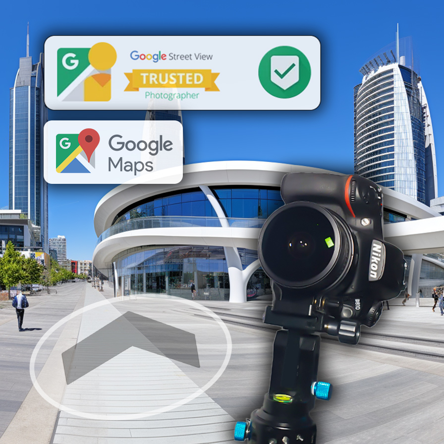 - Google Street View: Standardowa funkcjonalność, ograniczone elementy interaktywne do przemieszczania pomiędzy panoramami 360 stopni. Wielkość panoram do 12K